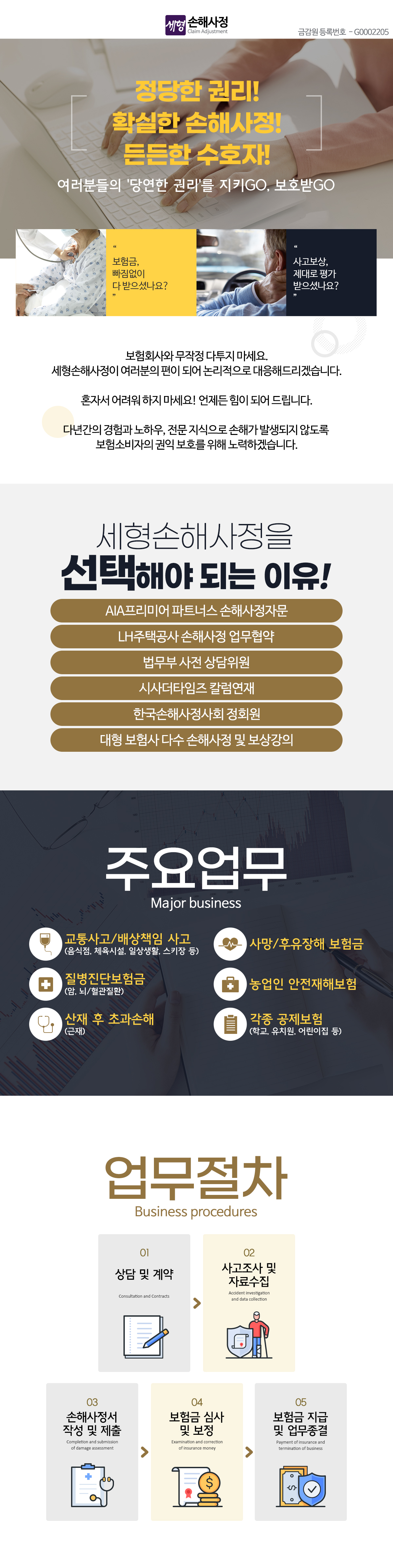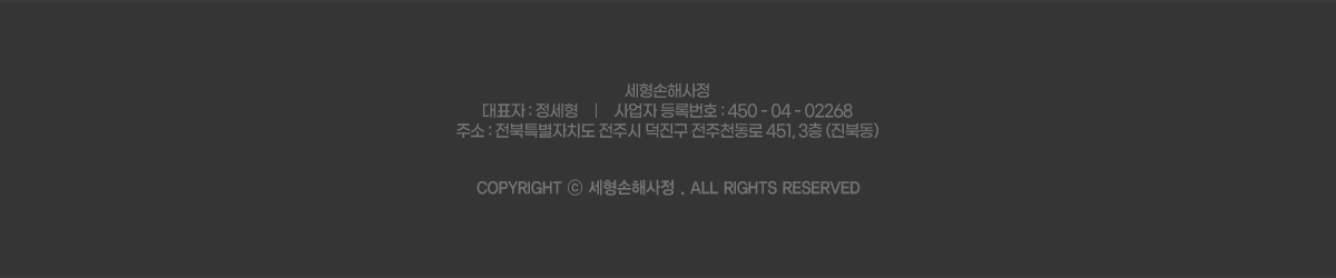 '세형손해사정'은(는) (이하 '회사'는) 고객님의 개인정보를 중요시하며, "정보통신망 이용촉진 및 정보보호"에 관한 법률을 준수하고 있습니다. 회사는 개인정보취급방침을 통하여 고객님께서 제공하시는 개인정보가 어떠한 용도와 방식 으로 이용되고 있으며, 개인정보보호를 위해 어떠한 조치가 취해지고 있는지 알려드립니다. 회사는 개인정보취급방침을 개정하는 경우 웹사이트 공지사항(또는 개별공지)을 통하여 공지할 것입니다. ■ 수집하는 개인정보 항목 회사는 회원가입, 상담, 서비스 신청 등등을 위해 아래와 같은 개인정보를 수집하고 있습니다. ο 수집항목 : 이름 , 생년월일 , 성별 , 로그인ID , 비밀번호 , 자택 전화번호 , 자택 주소 , 휴대전화번호 , 이메일 , 회사전화번호 , 결혼여부 , 기념일 , 주민등록번호 , 신용카드 정보 , 은행계좌 정보 , 서비스 이용기록 , 접속 로그 , 쿠키 , 접속 IP 정보 , 결제기록 ο 개인정보 수집방법 : 홈페이지(회원가입,상담신청,공개게시판,견적요청 등) , 서면양식 , 전화/팩스를 통한 회원가입 , 경품 행사 응모 , 제휴사로부터의 제공 ■ 개인정보의 수집 및 이용목적 외 이용 및 제3자 제공 회사는 수집한 개인정보를 다음의 목적을 위해 활용합니다. ο 서비스 제공에 관한 계약 이행 및 서비스 제공에 따른 요금정산 콘텐츠 제공 , 구매 및 요금 결제 , 물품배송 또는 청구지 등 발송 , 금융거래 본인 인증 및 금융 서비스 , 요금추심 ο 회원 관리 회원제 서비스 이용에 따른 본인확인 , 개인 식별 , 불량회원의 부정 이용 방지와 비인가 사용 방지 , 가입 의사 확인 , 연령확인 , 만14세 미만 아동 개인정보 수집 시 법정 대리인 동의여부 확인 , 불만처리 등 민원처리 , 고지사항 전달 ο 마케팅 및 광고에 활용 신규 서비스(제품) 개발 및 특화 , 이벤트 등 광고성 정보 전달 , 인구통계학적 특성에 따른 서비스 제공 및 광고 게재 , 접속 빈도 파악 또는 회원의 서비스 이용에 대한 통계 ο 기타 사후DM ο 당사는 회원의 개인정보를「개인정보 수집 이용 목적 및 항목」에서 고지한 범위 내에서 사용하며 동 범위를 초과하여 이용하거나 원칙적으로 제3자에게 제공하지 않습니다. ο 다만 다음의 경우에는 합당한 절차를 통한 회원의 동의를 얻어 개인정보를 제공 또는 이용할 수 있습니다. 1) 제휴관계 : 보다 나은 서비스 제공을 위하여 당사는 회원의 개인정보를 제휴사에 제공 할 수 있습니다. 이 경우 사전에 회원에게 제휴사, 제공되는 개인정보의 항목, 개인정보 제공 목적, 제공기간, 개인정보보호방안 등에 대해서 개별적으로 동의를 구하는 절차를 거치게 되며, 회원의 동 의가 없는 경우에는 제휴사에게 이를 제공하지 않으며, 제휴관계의 변화 또는 종결될 경우에도 고지 합니다. 또한 제휴관계가 종결될 경우 제공된 개인정보에 대해서는 회원님의 동의가 없는 경우 지체 없이 파기하도록 조치하며 개인정보 제공에 동의하더라도 언제든지 그 동의를 철회할 수 있습니다. 2) 위탁처리 : 원활한 업무처리와 회원에게 보다 나은 서비스 제공을 위하여 회원의 개인정보를 위탁하여 처리할 수 있으며, 이 경우 반드시 사전에 위탁처리 업체명과 목적, 위탁처리 되는 개인 정보의 범위, 위탁기간 등에 대해 상세하게 고지합니다. 3) 매각, 인수합병 : 서비스 제공자의 권리, 의무가 승계 또는 이전되는 경우 이를 반드시 사전에 고지하며 회원의 개인정보에 대한 동의철회의 선택권을 부여합니다. ο 다음은 예외로 합니다. 1) 관계법령에 특별한 규정이 있는 경우 2) 서비스 제공에 따른 요금정산을 위하여 필요한 경우 3) 당사가 제공하는 서비스를 통하여 거래가 성사된 경우 거래당사자간의 원활한 의사소통과 거래, 배송을 위하여 관련된 정보를 필요한 범위 내에서 거래당사자에게 제공하는 경우 ■ 개인정보의 보유 및 이용기간 원칙적으로, 개인정보 수집 및 이용목적이 달성된 후에는 해당 정보를 지체 없이 파기합니다. 단, 다음의 정보에 대해서는 아래의 이유로 명시한 기간 동안 보존합니다. 보존 항목 : 이름 , 생년월일 , 성별 , 로그인ID , 비밀번호 , 자택 전화번호 , 자택 주소 , 휴대전화번호 , 이메일 , 회사전화번호 , 결혼여부 , 기념일 , 주민등록번호 , 신용카드 정보 , 은행계좌 정보 , 접속 IP 정보 , 결제기록 보존 근거 : 이용자가 아이웨딩의 회원으로서 아이웨딩이 제공하는 서비스를 이용하는 동안 아이웨딩은 이용자들의 개인정보를 계속적으로 보유하며 서비스 제공 등을 위해 이용합니다. 다만, 아래의 "이용자 자신의 개인 정보 관리(열람,정정,삭제 등)에 관한 사항"에서 설명한 절차와 방법에 따라 회원 본인이 직접 삭제하거나 수정한 정보, 가입해지를 요청한 경우에는 재생할 수 없는 방법에 의하여 디스크에서 완전히 삭제하며 추후 열람이나 이용이 불가능한 상태로 처리됩니다. 또한 최근 6개월 내에 ms커뮤니케이션을 한번도 이용하지 않은 ID에 대해 홈페이지에서 ID 정리 해당 요건 및 정리 기간, ID 폐기에 대해 일괄 공지한 후 적절한 절차를 거쳐 아이웨딩 사용 의사가 없는 것으로 판단되는 이용자에 한해서는, 개인정보 보호를 위해 해당 ID의 개인정보를 
